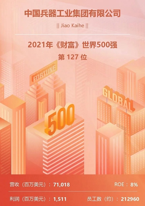 中國兵器工業(yè)集團有限公司位列世界500強第127位,連續(xù)12年上榜。