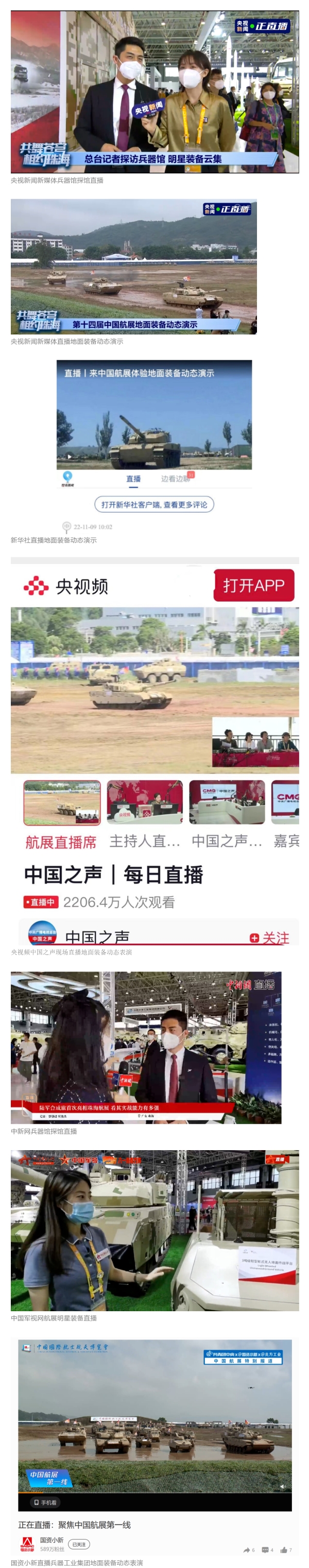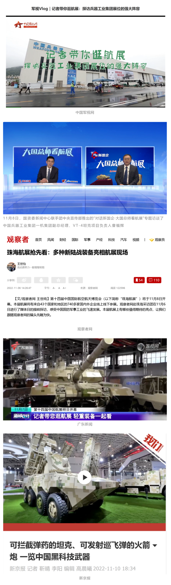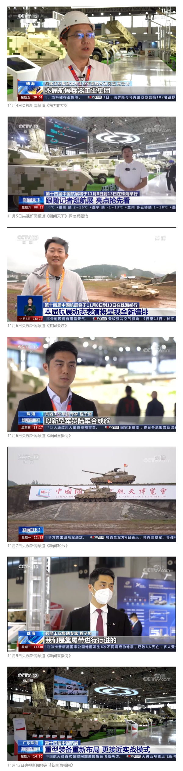 央視國(guó)防軍事頻道航展特別報(bào)道《炫舞天地間》11月12日《賞“鐵甲雄風(fēng)”!看航展地面裝備“鋼鐵洪流”名場(chǎng)面》對(duì)兵器工業(yè)集團(tuán)武器裝備特色亮點(diǎn)進(jìn)行報(bào)道?!秶?guó)防軍事早報(bào)》11月7日推出報(bào)道《第十四屆中國(guó)國(guó)際航空航天博覽會(huì)明天開(kāi)幕 中國(guó)兵器館首次以陸軍合成旅實(shí)戰(zhàn)體系形式展出》,對(duì)兵器館陸軍合成旅實(shí)戰(zhàn)體系進(jìn)行報(bào)道?!盾娛聢?bào)道》11月9日推出《第十四屆中國(guó)國(guó)際航空航天博覽會(huì) 地面兵器裝備首次聯(lián)合陸航直升機(jī)進(jìn)行動(dòng)態(tài)展示》報(bào)道?!盾娒孕刑煜隆?1月9日推出報(bào)道《軍迷打卡航展2022》以專(zhuān)業(yè)軍迷視角探館兵器館,全面展示兵器工業(yè)集團(tuán)參展裝備特色亮點(diǎn)。