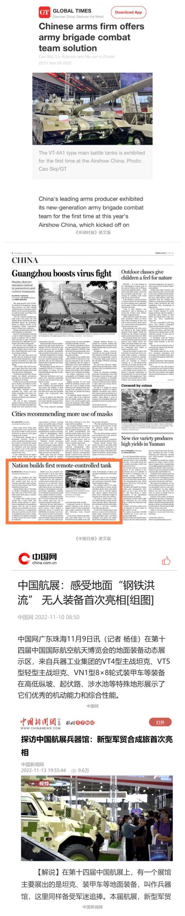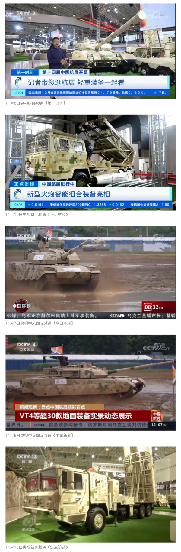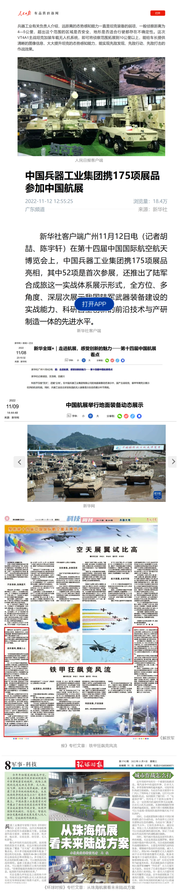 央視國(guó)防軍事頻道航展特別報(bào)道《炫舞天地間》11月12日《賞“鐵甲雄風(fēng)”!看航展地面裝備“鋼鐵洪流”名場(chǎng)面》對(duì)兵器工業(yè)集團(tuán)武器裝備特色亮點(diǎn)進(jìn)行報(bào)道?!秶?guó)防軍事早報(bào)》11月7日推出報(bào)道《第十四屆中國(guó)國(guó)際航空航天博覽會(huì)明天開(kāi)幕 中國(guó)兵器館首次以陸軍合成旅實(shí)戰(zhàn)體系形式展出》,對(duì)兵器館陸軍合成旅實(shí)戰(zhàn)體系進(jìn)行報(bào)道?!盾娛聢?bào)道》11月9日推出《第十四屆中國(guó)國(guó)際航空航天博覽會(huì) 地面兵器裝備首次聯(lián)合陸航直升機(jī)進(jìn)行動(dòng)態(tài)展示》報(bào)道?!盾娒孕刑煜隆?1月9日推出報(bào)道《軍迷打卡航展2022》以專(zhuān)業(yè)軍迷視角探館兵器館,全面展示兵器工業(yè)集團(tuán)參展裝備特色亮點(diǎn)。