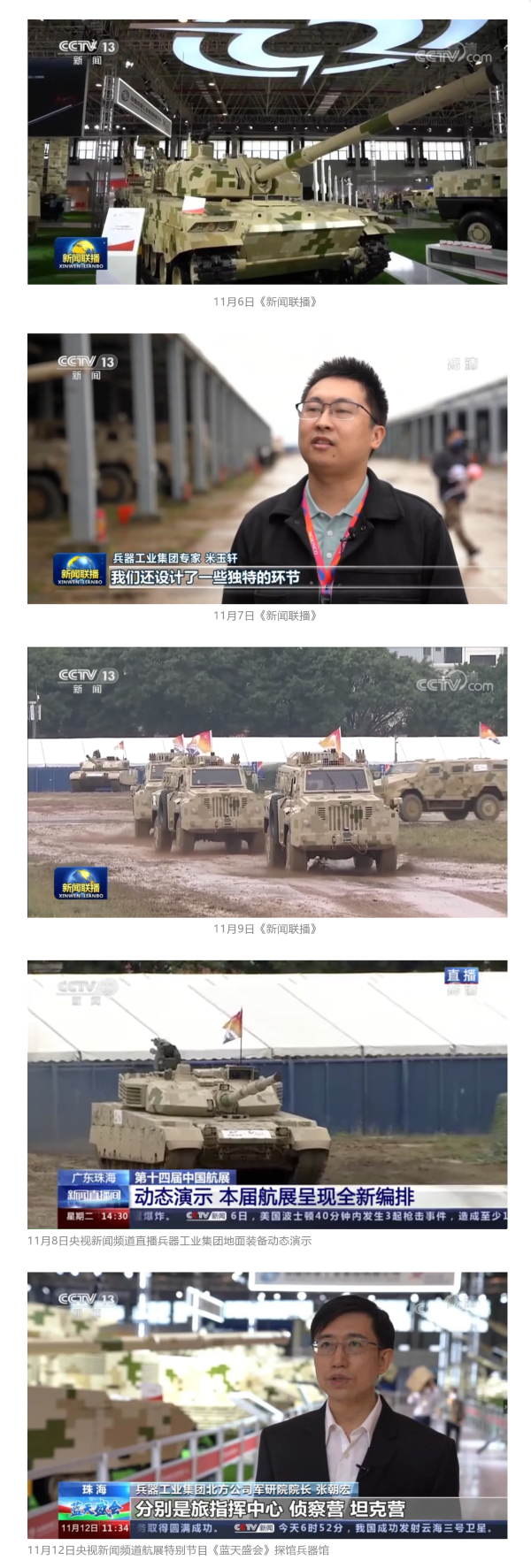 11月6日、7日、9日,央視《新聞聯(lián)播》三次報(bào)道兵器工業(yè)集團(tuán)參展情況,重點(diǎn)介紹了集團(tuán)公司總體參展情況、地面裝備動(dòng)態(tài)演示全新編排、國(guó)產(chǎn)輪式反伏擊車(chē)首次采用有人駕駛和無(wú)人駕駛混合編隊(duì)等內(nèi)容。11月8日,央視新聞?lì)l道直播地面裝備動(dòng)態(tài)演示;11月12日,央視新聞?lì)l道航展特別報(bào)道《藍(lán)天盛會(huì)》探訪(fǎng)兵器館,采訪(fǎng)兵器工業(yè)集團(tuán)嘉賓對(duì)陸軍合成旅作了報(bào)道。