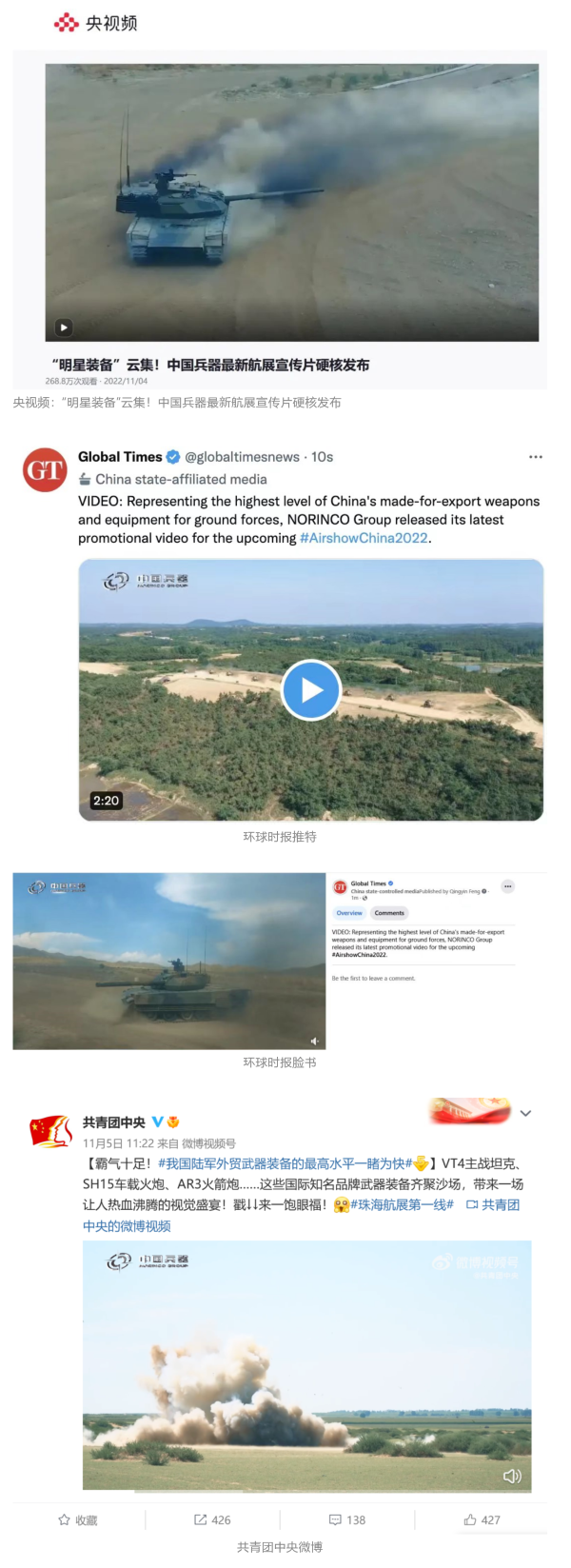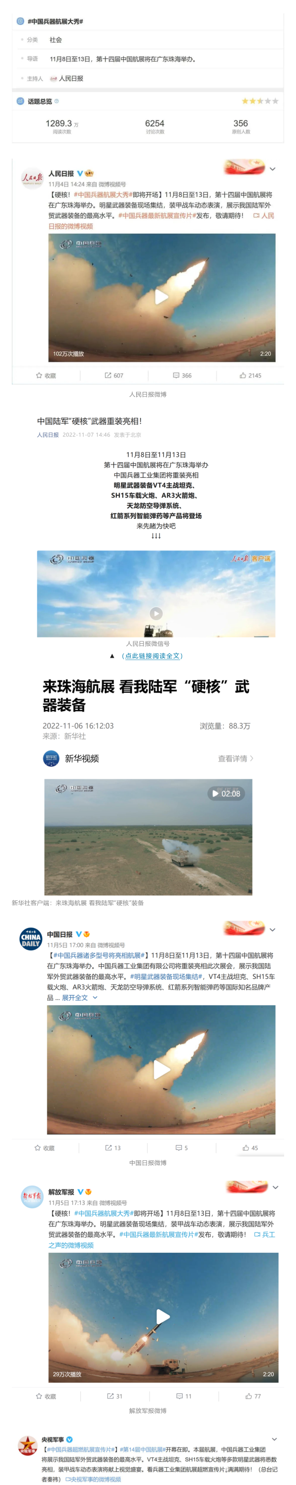 人民日?qǐng)?bào)官方微博、微信公眾號(hào),新華社客戶(hù)端、央視新聞客戶(hù)端、中國(guó)日?qǐng)?bào)微博、參考消息微信公眾號(hào)、解放軍報(bào)微博、央視軍事微博、CGTN微博、中國(guó)軍號(hào)微博、共青團(tuán)中央微博、環(huán)球時(shí)報(bào)(英文網(wǎng)站、臉書(shū)賬號(hào)、推特賬號(hào))、嗶哩嗶哩、學(xué)習(xí)強(qiáng)國(guó)平臺(tái)、國(guó)資小新視頻號(hào)、網(wǎng)易軍事、騰訊軍事、鳳凰軍事、北京日?qǐng)?bào)、東方衛(wèi)視看看新聞全媒體、北京電視臺(tái)等20余家中央主流媒體、國(guó)家部委、省市媒體的新媒體第一時(shí)間播發(fā)集團(tuán)公司航展宣傳片等視頻作品燃爆全網(wǎng),累計(jì)閱讀量突破1700萬(wàn)人次。集團(tuán)公司微信公眾號(hào)、微博、抖音號(hào)、快手號(hào)、微信視頻號(hào)、知乎號(hào)等新媒體宣傳片播放閱讀量超過(guò)800萬(wàn)人次,點(diǎn)贊超過(guò)30萬(wàn)人次。集團(tuán)公司微信公眾號(hào)推出《硬核!中國(guó)兵器最新航展宣傳片發(fā)布》《中國(guó)兵器航展節(jié)目單,請(qǐng)選出心中明星裝備》《航展首日,中國(guó)兵器閃耀亮相!》等7篇報(bào)道,閱讀量超過(guò)25萬(wàn)人次,集團(tuán)公司微信視頻號(hào)、抖音號(hào)、快手號(hào)等新媒體賬號(hào)發(fā)布“中國(guó)兵器航展大秀”系列視頻,觀(guān)看量超過(guò)330萬(wàn)人次。