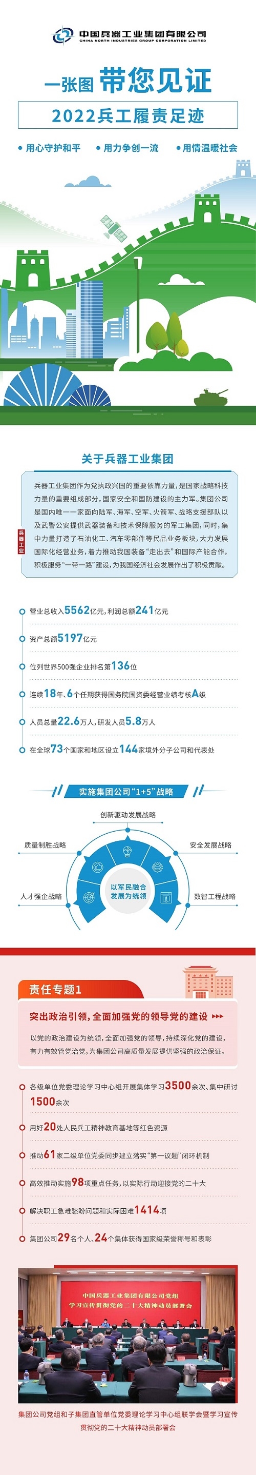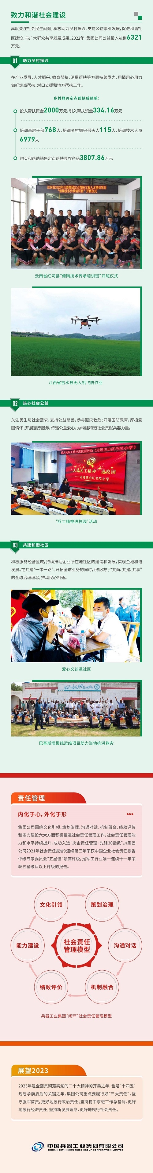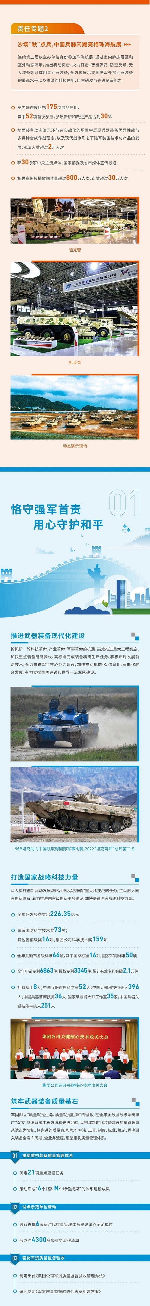 《中國兵器工業(yè)集團(tuán)有限公司2022年社會責(zé)任報(bào)告》(以下簡稱《報(bào)告》)是集團(tuán)公司發(fā)布的第十四份年度社會責(zé)任報(bào)告,經(jīng)中國企業(yè)社會責(zé)任報(bào)告評級專家委員會評定,《報(bào)告》第四年獲得“五星佳”最高評級。 《報(bào)告》開篇設(shè)置“突出政治引領(lǐng),全面加強(qiáng)黨的領(lǐng)導(dǎo)黨的建設(shè)”“沙場‘秋’點(diǎn)兵,中國兵器閃耀亮相珠海航展”兩個責(zé)任專題,聚焦集團(tuán)公司加強(qiáng)黨建、強(qiáng)軍報(bào)國的擔(dān)當(dāng)作為,書寫集團(tuán)公司在新時代新征程上的奮進(jìn)答卷。主體章節(jié)以“用心守護(hù)和平、用力爭創(chuàng)一流、用情溫暖社會”為主題,從恪守強(qiáng)軍首責(zé)、服務(wù)經(jīng)濟(jì)建設(shè)、共創(chuàng)美好生活三個維度展現(xiàn)了集團(tuán)公司立足“1+5”戰(zhàn)略和“雙十”規(guī)劃,聚焦新時代新征程新任務(wù)高質(zhì)量履行政治責(zé)任、經(jīng)濟(jì)責(zé)任和社會責(zé)任的具體行動和成效亮點(diǎn),詮釋了集團(tuán)公司服務(wù)國家戰(zhàn)略、服務(wù)國防和軍隊(duì)現(xiàn)代化建設(shè)、服務(wù)國家經(jīng)濟(jì)社會發(fā)展的職責(zé)使命。 文/社會責(zé)任部 |