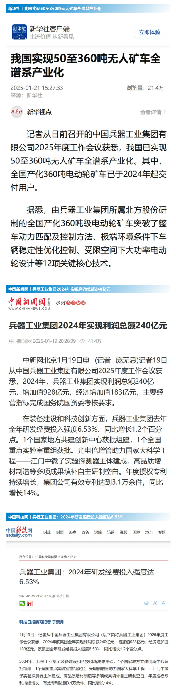 1月19日至20日,中國(guó)兵器工業(yè)集團(tuán)有限公司2025年度工作會(huì)議在京召開,會(huì)議總結(jié)2024年工作,分析形勢(shì)任務(wù),明確工作思路,部署2025年工作。 集團(tuán)公司2024年取得的成績(jī)及下一步重點(diǎn)工作受到社會(huì)媒體廣泛關(guān)注。新華社、中國(guó)新聞網(wǎng)、中國(guó)科技網(wǎng)、光明日?qǐng)?bào)客戶端、經(jīng)濟(jì)日?qǐng)?bào)客戶端、中國(guó)日?qǐng)?bào)網(wǎng)、國(guó)務(wù)院國(guó)資委網(wǎng)站、學(xué)習(xí)強(qiáng)國(guó)中央企業(yè)學(xué)習(xí)平臺(tái)、新浪網(wǎng)、網(wǎng)易網(wǎng)、搜狐網(wǎng)、騰訊網(wǎng)、鳳凰網(wǎng)等中央主流媒體、國(guó)家部委網(wǎng)站及知名網(wǎng)絡(luò)媒體對(duì)集團(tuán)公司2025年度工作會(huì)議進(jìn)行了報(bào)道,重點(diǎn)關(guān)注集團(tuán)公司經(jīng)營(yíng)業(yè)績(jī)、科技創(chuàng)新、產(chǎn)業(yè)結(jié)構(gòu)布局優(yōu)化等情況。其中,新華社以《我國(guó)實(shí)現(xiàn)50至360噸無人礦車全譜系產(chǎn)業(yè)化》為題,重點(diǎn)報(bào)道了集團(tuán)公司在推動(dòng)智能制造水平提升方面取得的成效;中國(guó)新聞網(wǎng)、光明日?qǐng)?bào)客戶端、經(jīng)濟(jì)日?qǐng)?bào)客戶端、中國(guó)日?qǐng)?bào)網(wǎng)等就集團(tuán)公司2024年度經(jīng)營(yíng)業(yè)績(jī)及各項(xiàng)工作取得的成果進(jìn)行報(bào)道;中國(guó)科技網(wǎng)著重報(bào)道了集團(tuán)公司在科技創(chuàng)新和優(yōu)化產(chǎn)業(yè)結(jié)構(gòu)布局方面的最新進(jìn)展。集團(tuán)公司門戶網(wǎng)站、微信公眾號(hào)、微博等新媒體平臺(tái)以及《中國(guó)兵工報(bào)》也對(duì)集團(tuán)公司工作會(huì)議進(jìn)行了及時(shí)報(bào)道,各成員單位紛紛對(duì)相關(guān)內(nèi)容進(jìn)行轉(zhuǎn)載,引發(fā)全系統(tǒng)關(guān)注。 集團(tuán)公司職工及廣大網(wǎng)友熱議工作會(huì) “2025年工作會(huì)為我們指明了發(fā)展方向、明確了奮斗目標(biāo),面對(duì)全新的機(jī)遇和挑戰(zhàn),作為兵工人深感責(zé)任重大。” “科技是第一生產(chǎn)力,一定要以科技創(chuàng)新引領(lǐng)新質(zhì)生產(chǎn)力發(fā)展,為高質(zhì)量發(fā)展提供支撐?!?/p> “把各項(xiàng)工作做深、做實(shí)、做細(xì),努力為集團(tuán)公司高質(zhì)量發(fā)展添磚加瓦?!?/p> “2024年中國(guó)兵器展示了大國(guó)重器,祝新的一年中再創(chuàng)輝煌!” |