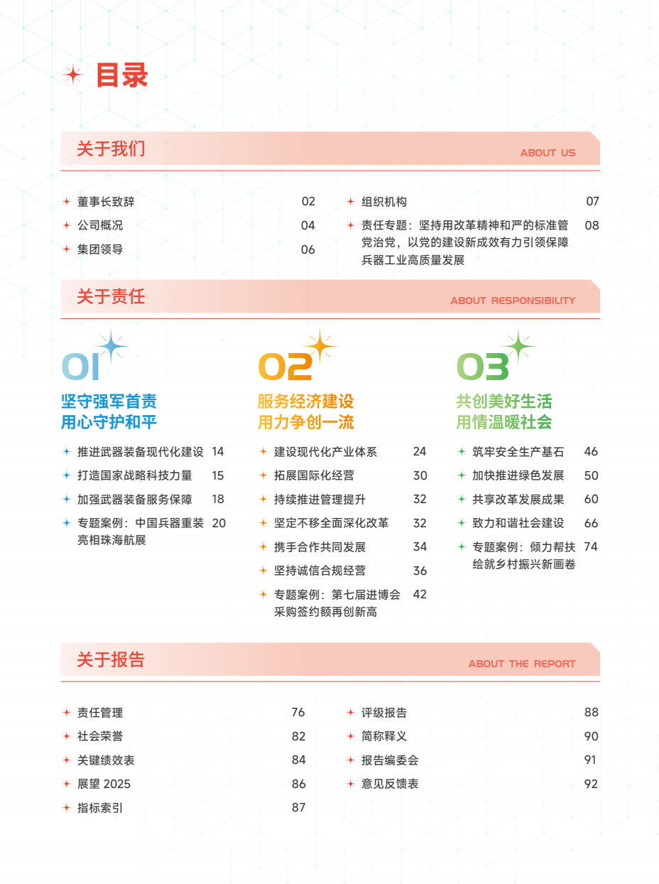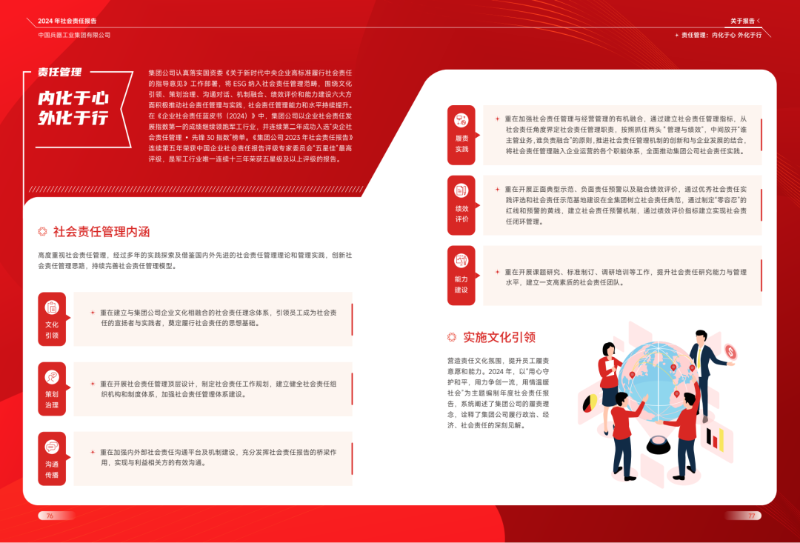 近日,中國兵器工業(yè)集團(tuán)有限公司正式發(fā)布《中國兵器工業(yè)集團(tuán)有限公司2024年度社會(huì)責(zé)任報(bào)告》。本次報(bào)告是集團(tuán)公司第16份年度社會(huì)責(zé)任報(bào)告,從堅(jiān)守強(qiáng)軍首責(zé)、服務(wù)經(jīng)濟(jì)建設(shè)、共創(chuàng)美好生活三個(gè)維度,全面展示集團(tuán)公司履行社會(huì)責(zé)任的實(shí)踐與成效。經(jīng)中國企業(yè)社會(huì)責(zé)任報(bào)告評(píng)級(jí)專家委員會(huì)評(píng)定,《報(bào)告》獲得“五星佳”最高評(píng)級(jí),成為軍工行業(yè)唯一一家連續(xù)6年獲此殊榮的中央企業(yè)。 兵器工業(yè)集團(tuán)2024年度社會(huì)責(zé)任報(bào)告 部分內(nèi)容摘錄 ↓↓↓ 文/社會(huì)責(zé)任部 |