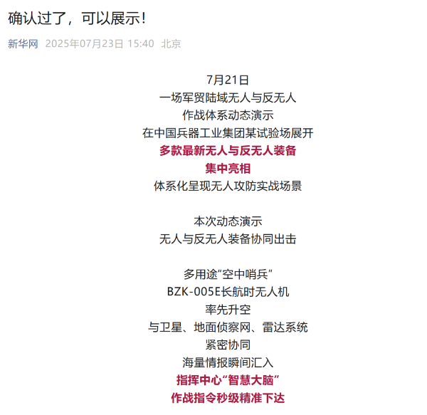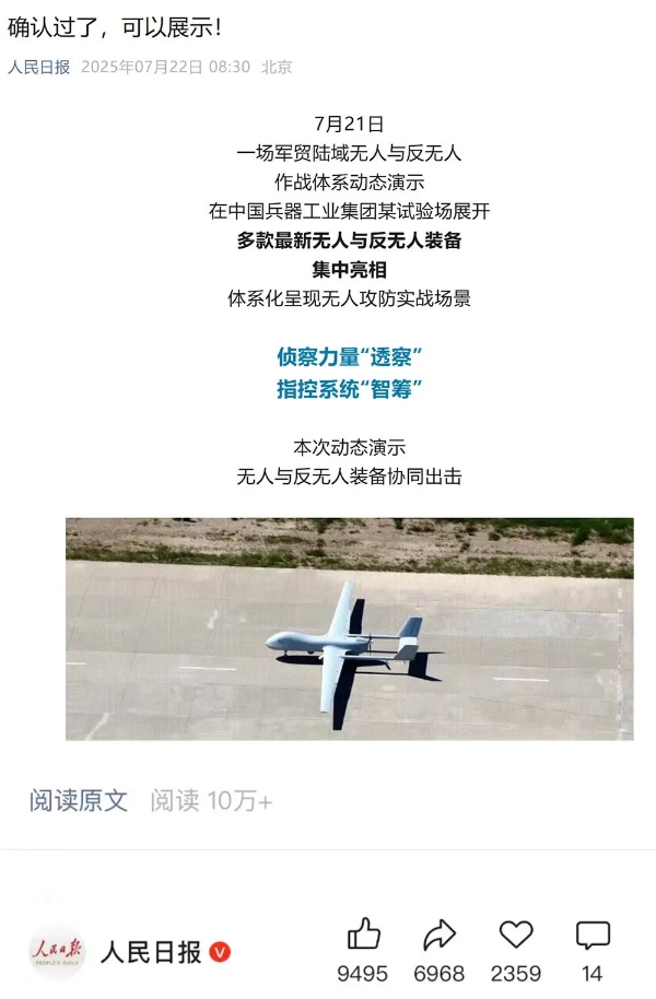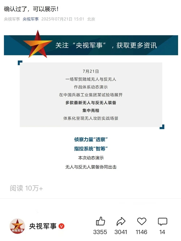 7月21日,中國兵器工業(yè)集團有限公司在位于內(nèi)蒙古的某試驗場舉辦軍貿(mào)陸域無人與反無人作戰(zhàn)體系主題日活動,攜無人機、巡飛彈、反無人機等最新武器裝備登場亮相,展現(xiàn)了一場無人與反無人領(lǐng)域激烈對抗的實戰(zhàn)場景。中央主流媒體、地方媒體、知名網(wǎng)絡(luò)媒體,以及集團公司各宣傳平臺紛紛進行報道,多次登上熱搜,引發(fā)廣泛關(guān)注。 央視新聞頻道《新聞直播間》《東方時空》《24小時》、國防軍事頻道《正午國防軍事》《軍事報道》《國防軍事早報》、中文國際頻道《今日環(huán)球》、央視軍事新媒體等報道了集團公司軍貿(mào)陸域無人與反無人作戰(zhàn)體系首次公開實裝動態(tài)演示有關(guān)情況,重點介紹了無人與反無人作戰(zhàn)最新裝備。 央視新聞頻道《新聞直播間》:內(nèi)蒙古 軍貿(mào)陸域無人與反無人作戰(zhàn)最新裝備亮相 央視新聞頻道《新聞直播間》:內(nèi)蒙古 軍貿(mào)陸域無人與反無人作戰(zhàn)最新裝備亮相 記者探訪無人裝備展區(qū) 央視新聞頻道《新聞直播間》:軍貿(mào)陸域無人與反無人作戰(zhàn)最新裝備亮相·記者探訪 最強“盾牌” 反無人機系統(tǒng)新升級 人民日報微博、央視軍事微博、央視新聞客戶端、中國新聞網(wǎng)、中新社國是直通車抖音、環(huán)球網(wǎng)微博、環(huán)球時報(X平臺、英文版客戶端)、中國日報網(wǎng)、央視軍事報道微博、中國軍號微博、中央廣播電視總臺“空天逐夢”微信視頻號、共青團中央B站、國資小新微博等中央主流媒體、國家部委的新媒體播發(fā)集團公司陸域無人與反無人作戰(zhàn)大片等視頻作品。 人民日報微博 央視軍事微博 人民日報、新華網(wǎng)、央視軍事、央視新聞、中央廣播電視總臺中國之聲、中國新聞網(wǎng)、中國日報網(wǎng)、中國日報英文報刊《CHINA DAILY》、《科技日報》、光明日報客戶端、環(huán)球網(wǎng)、環(huán)球時報、人民日報海外版-海外網(wǎng)、央視網(wǎng)、小央視頻、參考消息、瞭望東方周刊、共青團中央、國資小新新媒體、新浪網(wǎng)、騰訊網(wǎng)、搜狐網(wǎng)、鳳凰網(wǎng)、網(wǎng)易網(wǎng)等中央主流媒體、國家部委的新媒體及知名網(wǎng)絡(luò)媒體對集團公司軍貿(mào)陸域無人與反無人作戰(zhàn)體系主題日活動進行了圖文、音頻、視頻報道。 央視軍事微信 人民日報微信 新華網(wǎng)微信 來源/各主流媒體 |