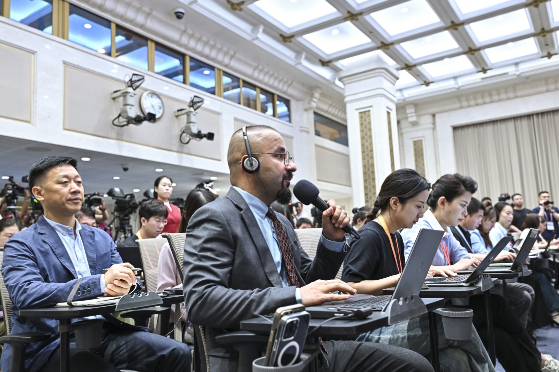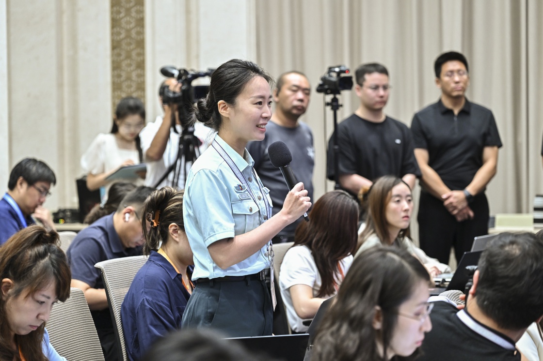 8月20日,國務(wù)院新聞辦公室在北京舉行新聞發(fā)布會(huì),閱兵領(lǐng)導(dǎo)小組辦公室副主任、中央軍委聯(lián)合參謀部作戰(zhàn)局少將副局長吳澤棵,中國人民解放軍中部戰(zhàn)區(qū)閱兵指揮機(jī)構(gòu)辦公室常務(wù)副主任、政治工作部少將副主任徐貴忠介紹閱兵準(zhǔn)備工作有關(guān)情況,并答記者問。這是記者在現(xiàn)場(chǎng)提問。